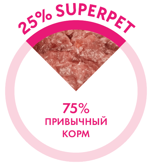 Продолжайте кормить, увеличивая долю питания SUPERPET и уменьшая долю привычного промышленного корма.