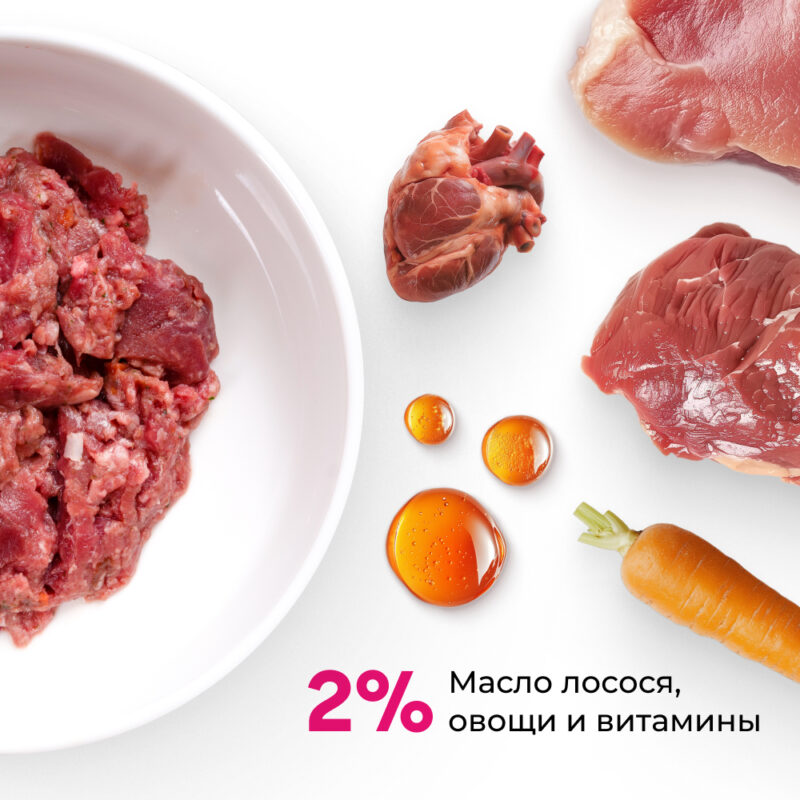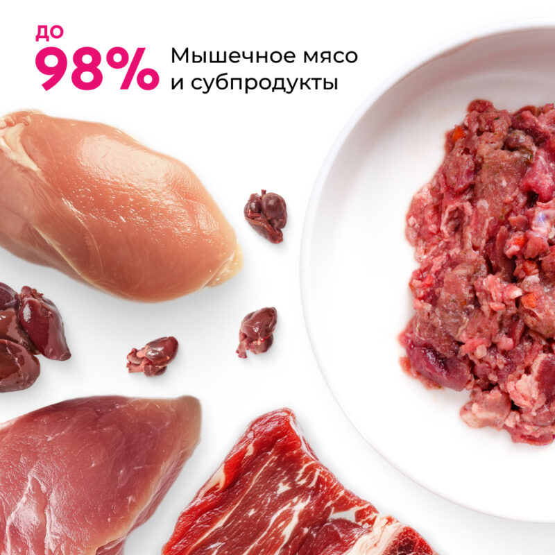 До 90% свежего мяса, мясных и костных субпродуктов идеально сбалансированы и готовы удовлетворять всем потребностям организма кошек и собак.
