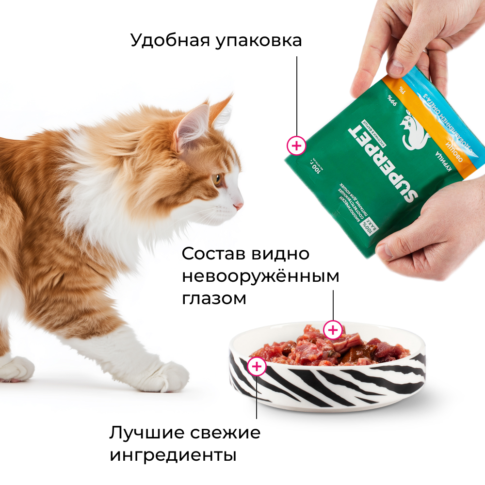 Секрет SUPERPET — в полном контроле на каждом этапе: от личного выбора лучших ингредиентов до собственного производства, упаковки и доставки питания прямо к вашему порогу. Благодаря такому подходу мы гарантируем качественный продукт, его пользу и безопасность.